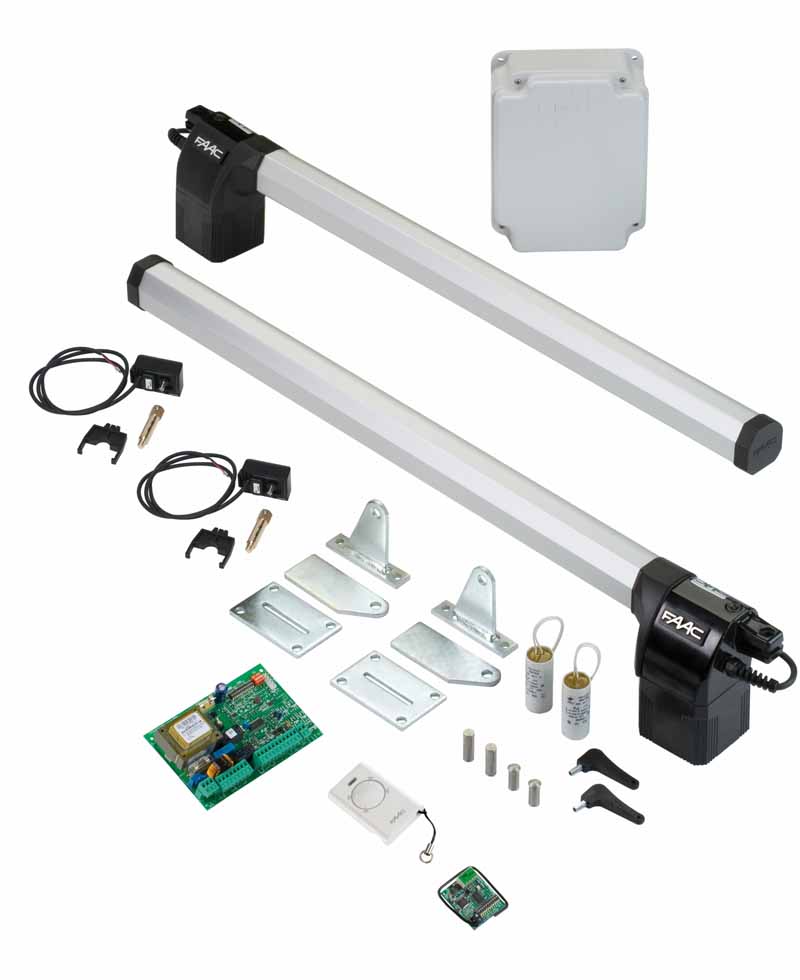 Hochwertiges Drehtor-Antriebsset für 2-flügelige Tore bis zu einer Flügelbreite von 1,8 m von FAAC, Europas führendem Hersteller für Tor-Automation.